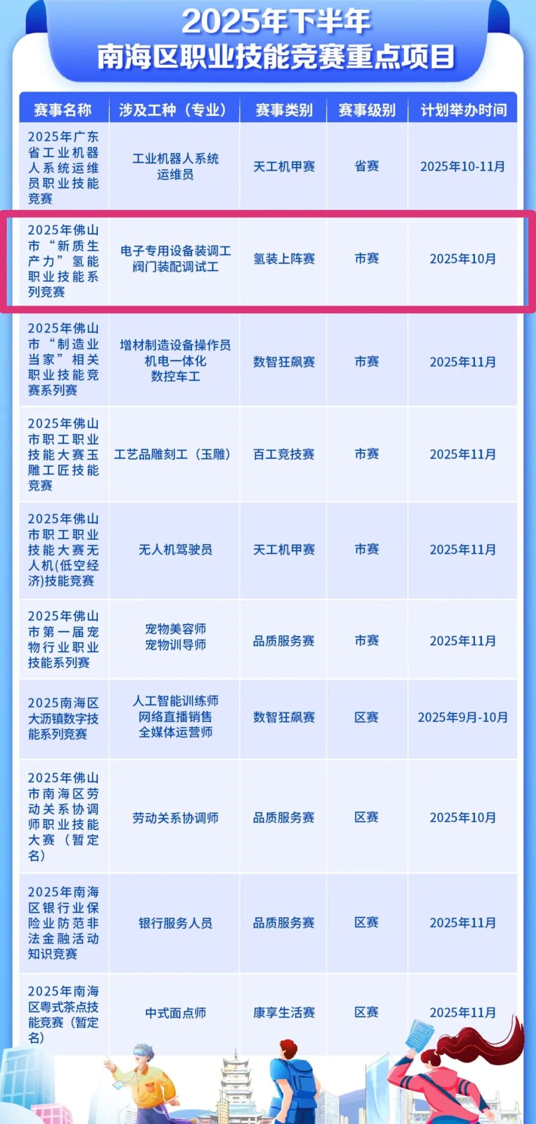 今年下半年,南海精选十大重点赛事,包括:佛山市“新质生产力”氢能职业技能系列竞赛、工业机器人系统运维员竞赛、玉雕竞赛、宠物行业系列赛等。
